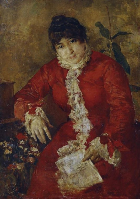 Anton Romako - Woman in red dress with a newspaper, 1884-89