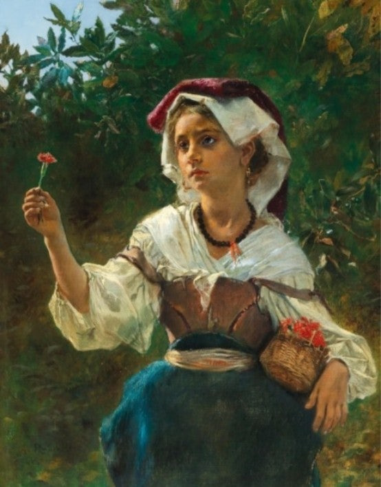 Anton Romako - Italian girl with a small basket and a carnation before a laurel bush