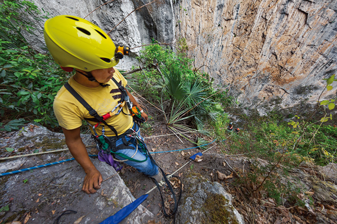 455m 깊이의 싱크홀로 내려가는 하강 작업을 지휘하고 있다.