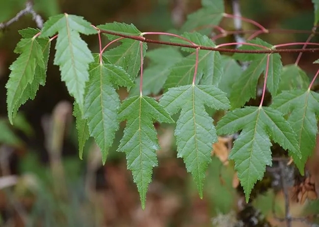 잎사귀가 날렵한 다른 단풍나무 잎과 대비됩니다.
