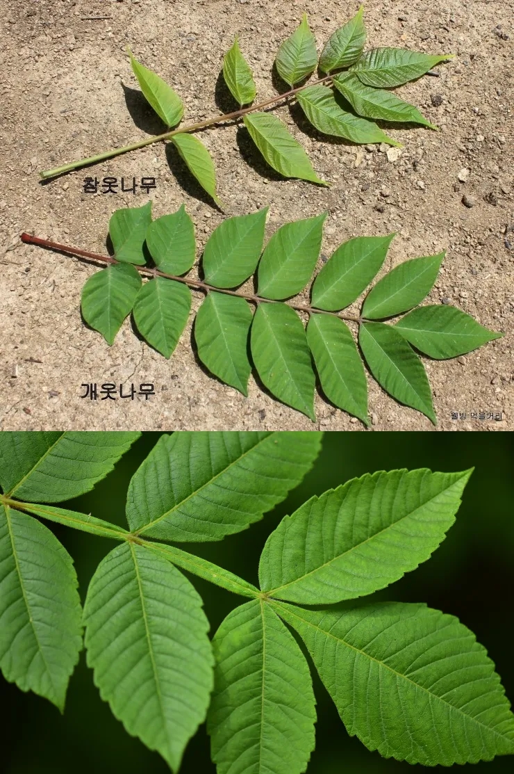 < 위: 참옻나무와 개옻나무의 잎, 아래: 붉나무의 잎 >