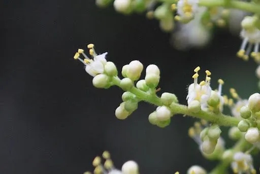 가지의 끝에 원뿔 모양의 꽃차례에 달리고,